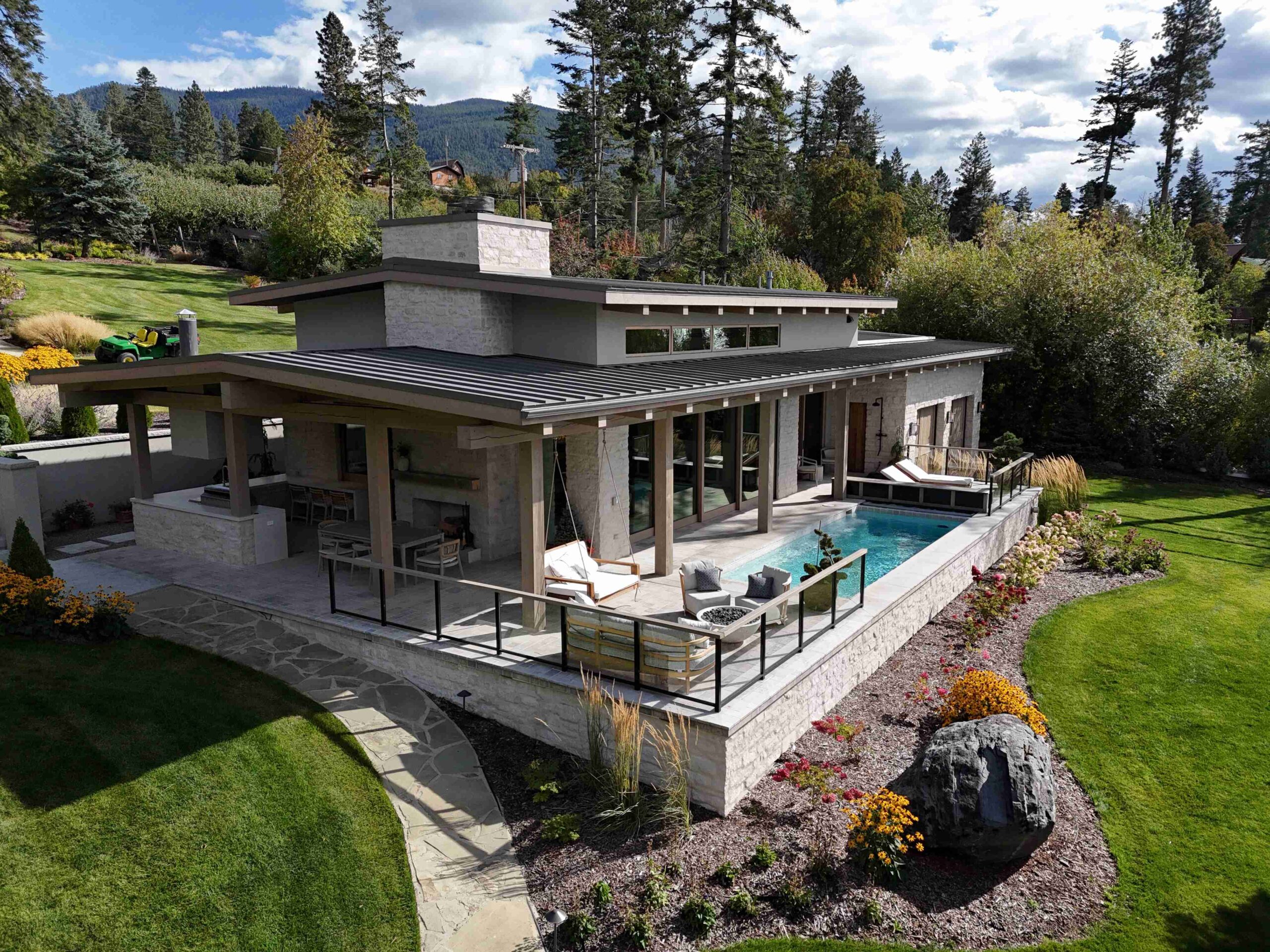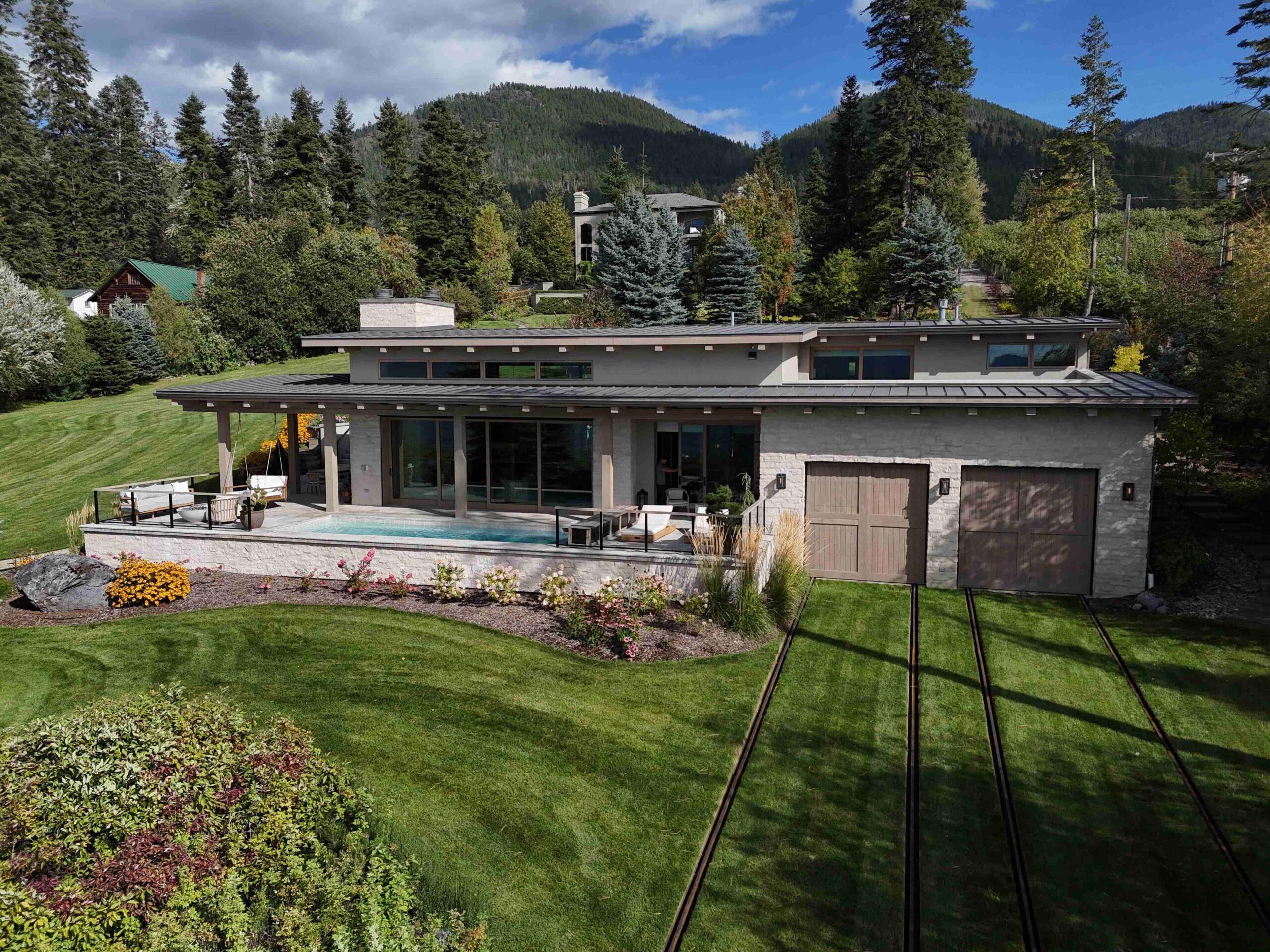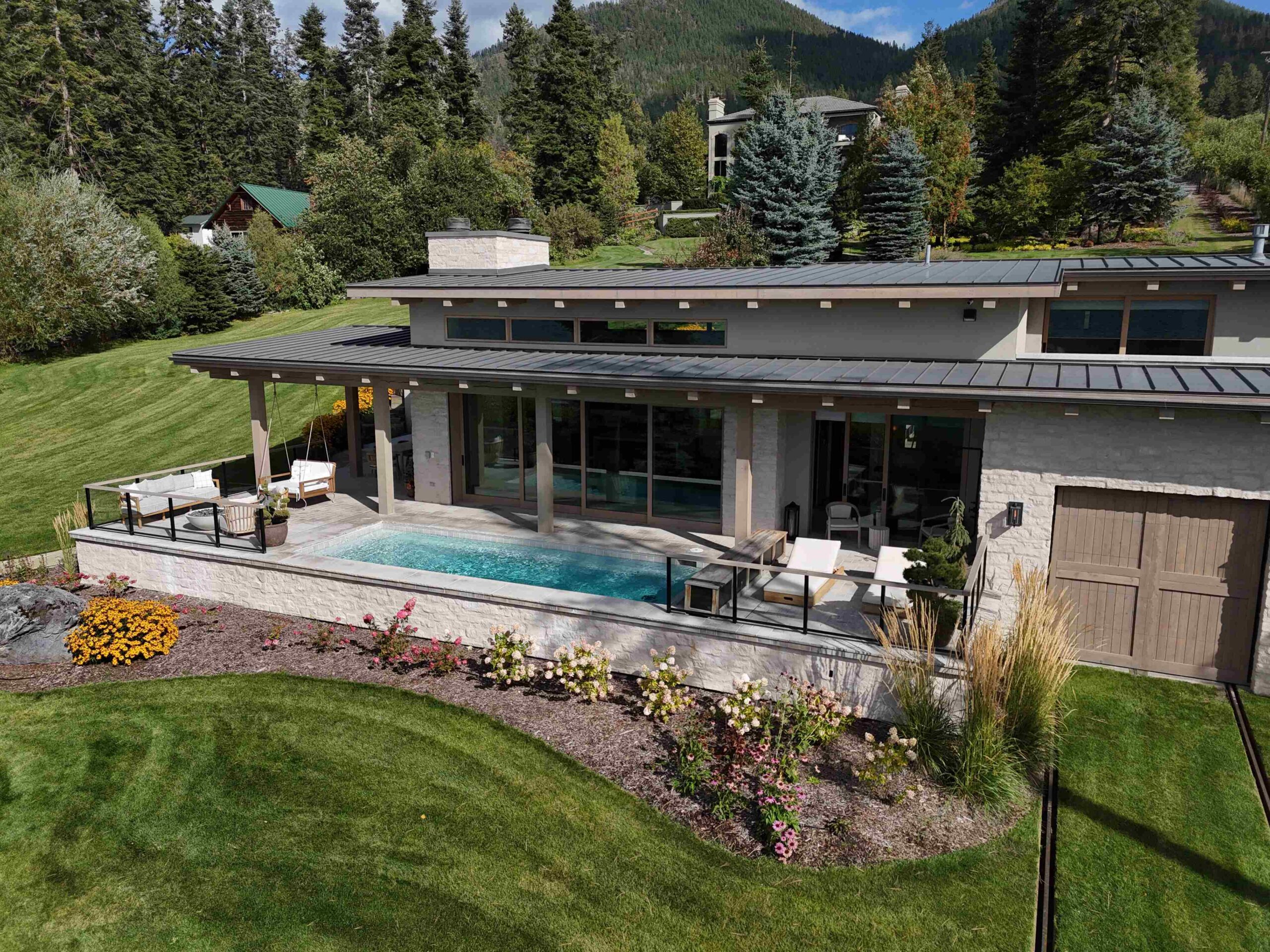 Montana Rockworks provided the Tumbled Middleton Limestone Thin Veneer, Beaver Creek Capstone, and various stone features such as Oxford Flooring Tile, Oxford Pavers, and Skyline Ridge Retaining Wall Stone, giving the property its stunning natural stone accents that reflect the rugged beauty of Montana’s landscape.