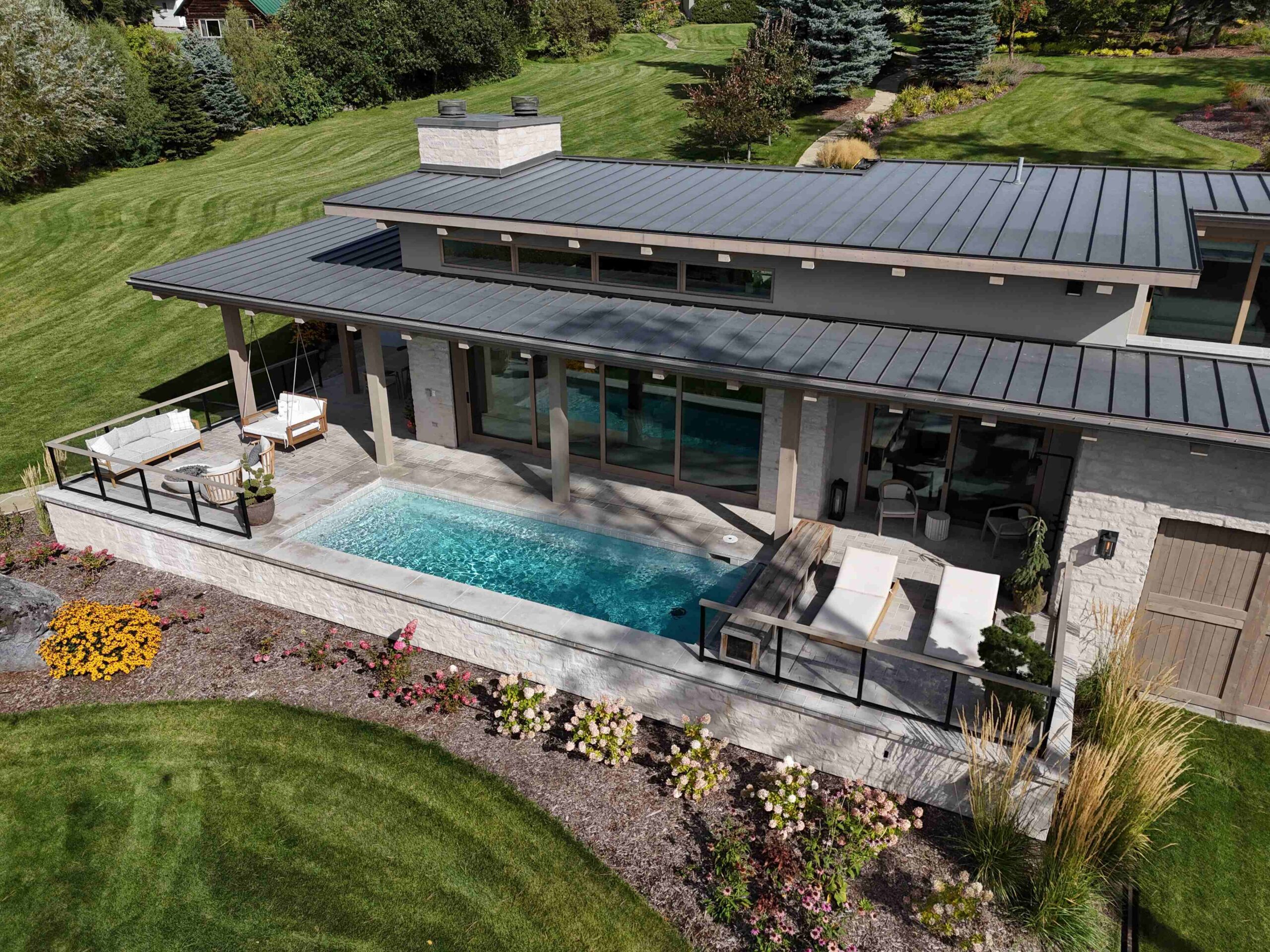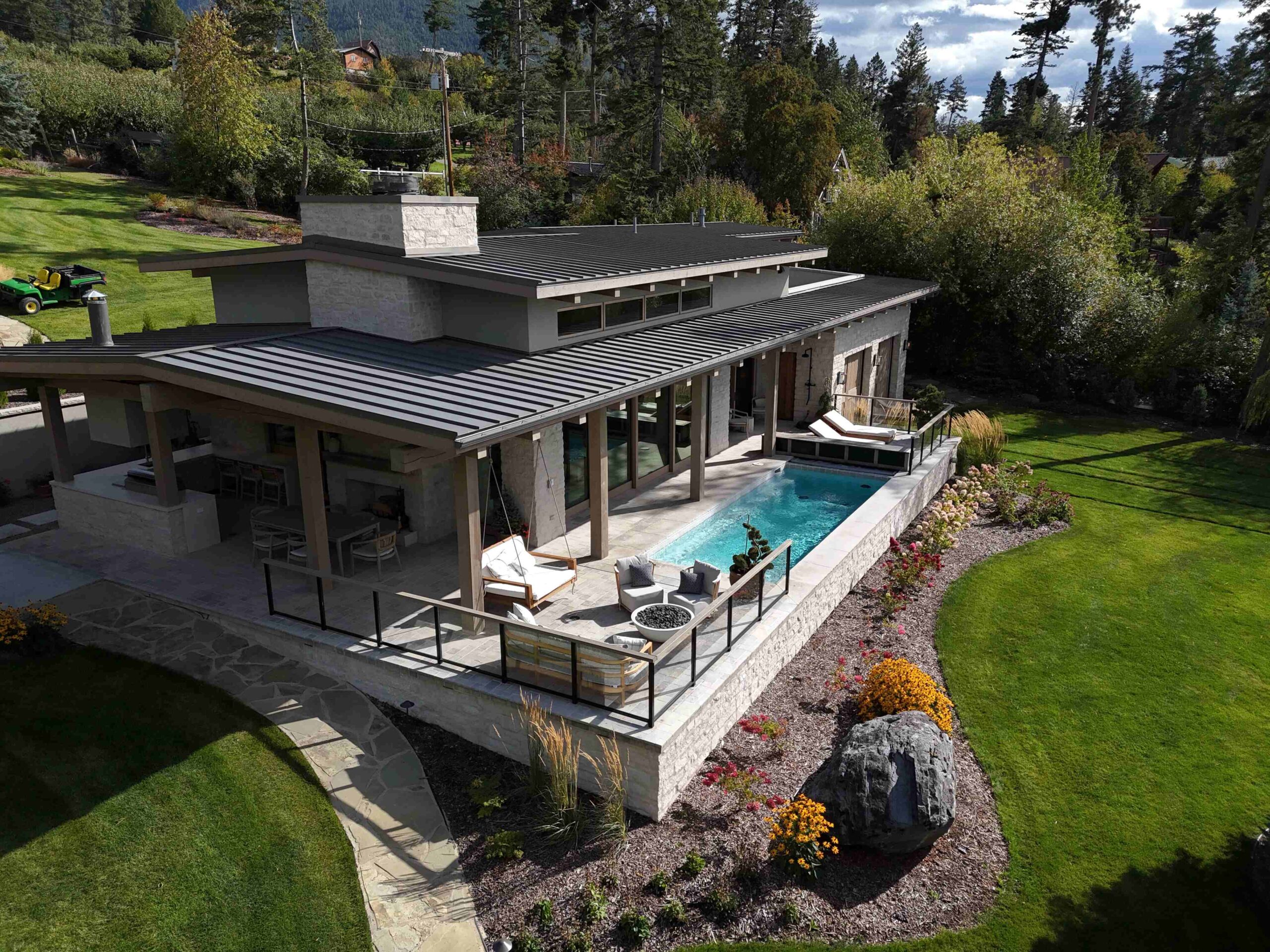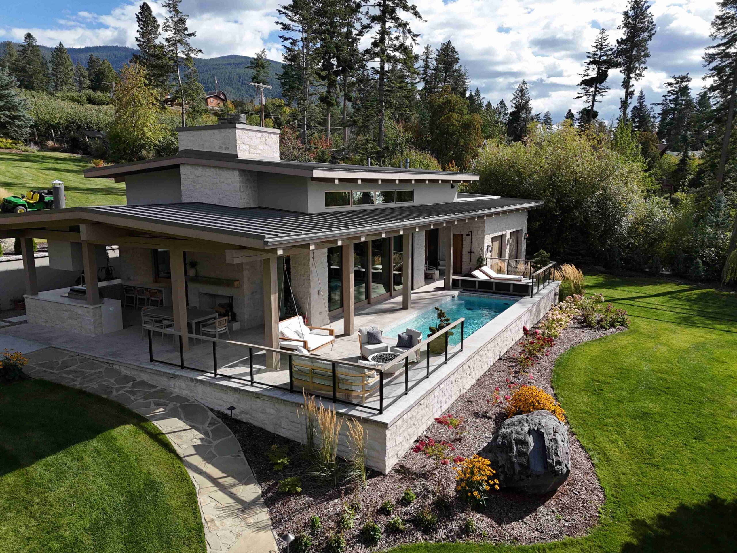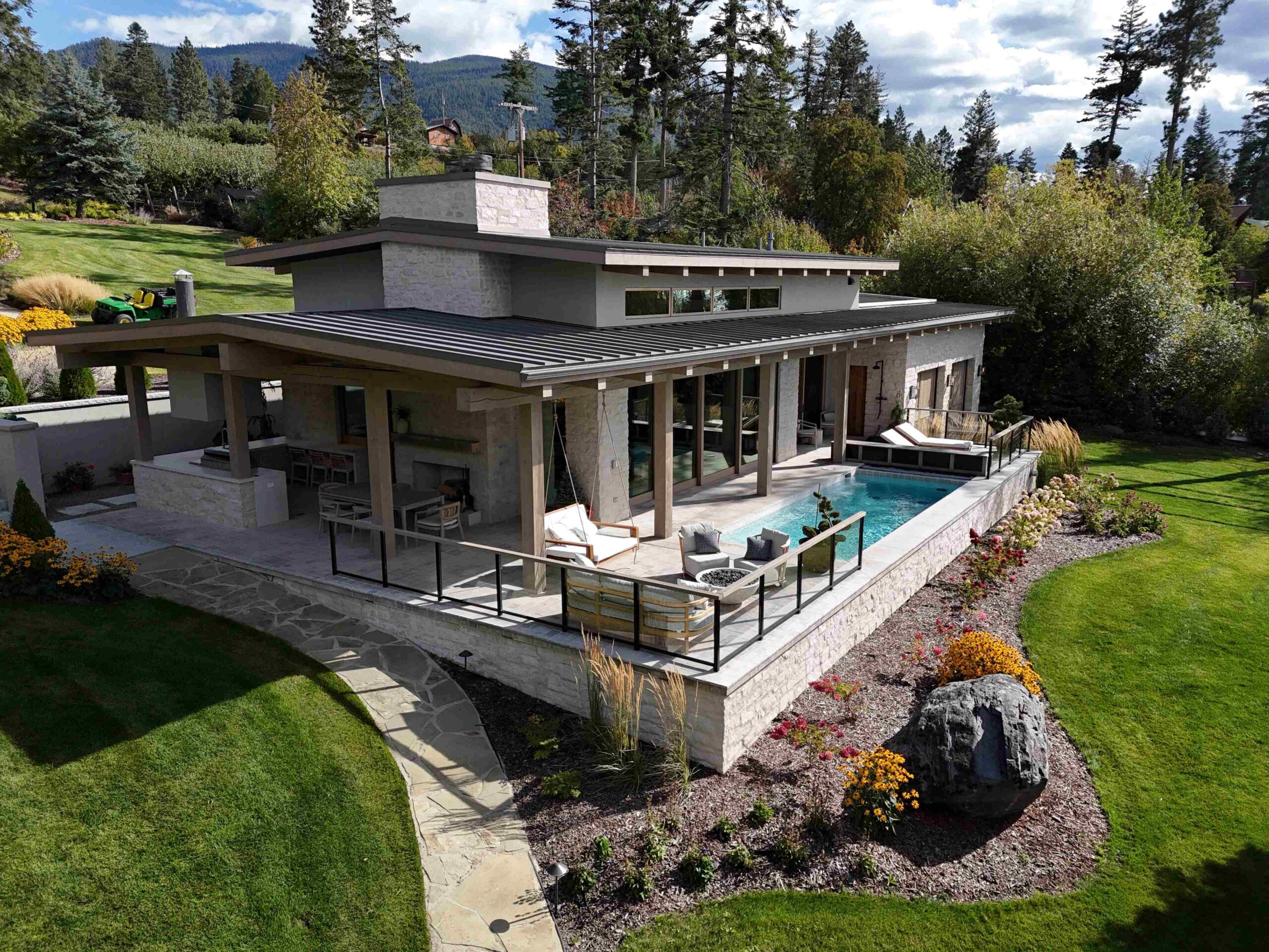 Montana Rockworks provided the Tumbled Middleton Limestone Thin Veneer, Beaver Creek Capstone, and various stone features such as Oxford Flooring Tile, Oxford Pavers, and Skyline Ridge Retaining Wall Stone, giving the property its stunning natural stone accents that reflect the rugged beauty of Montana’s landscape.
